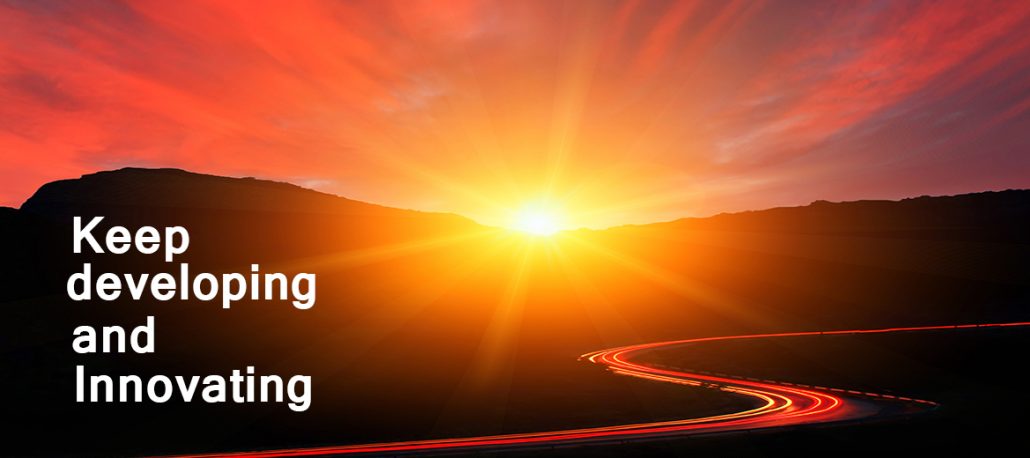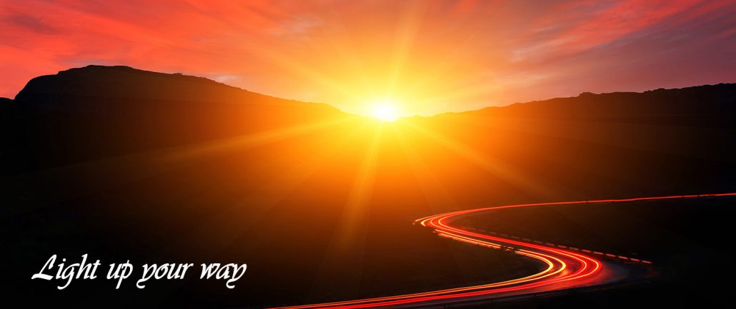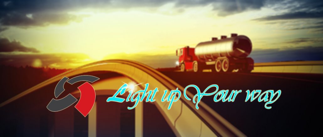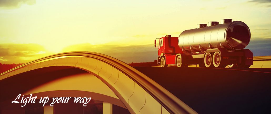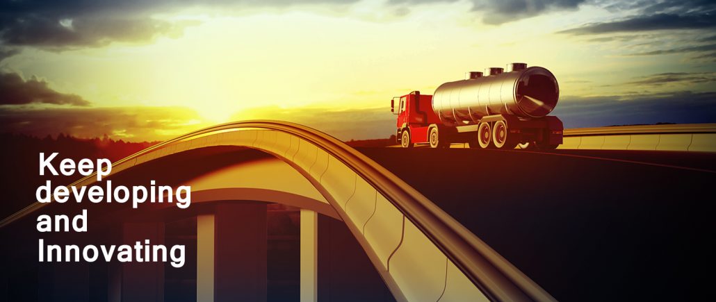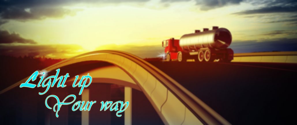 3d illustration of a red truck on blurry asphalt road under blue sky and sunset light